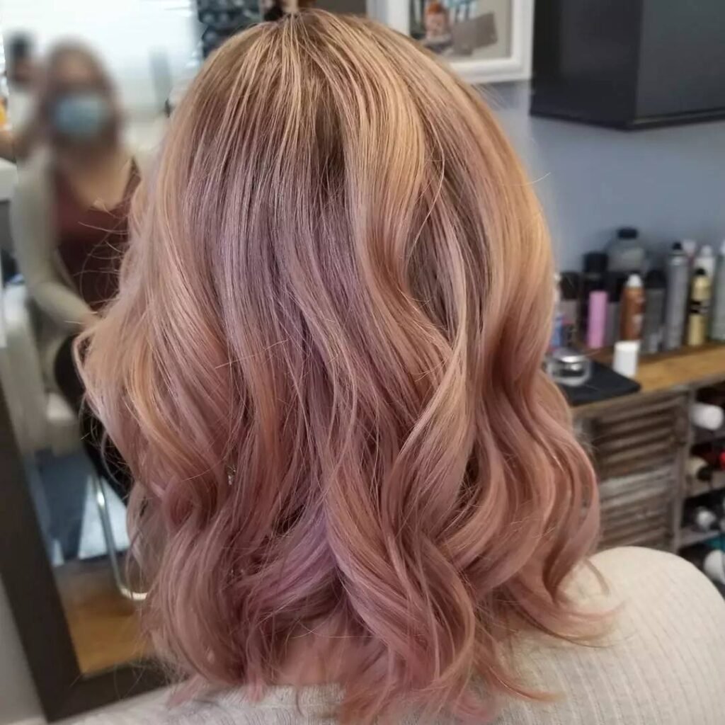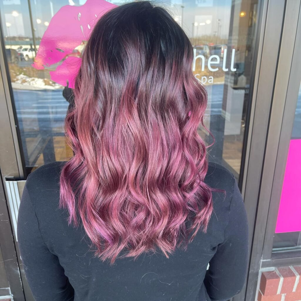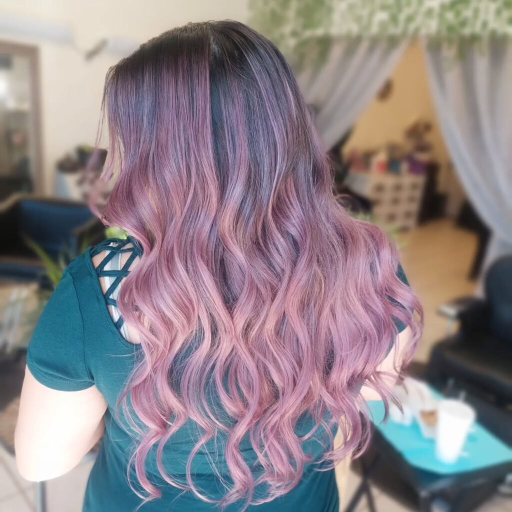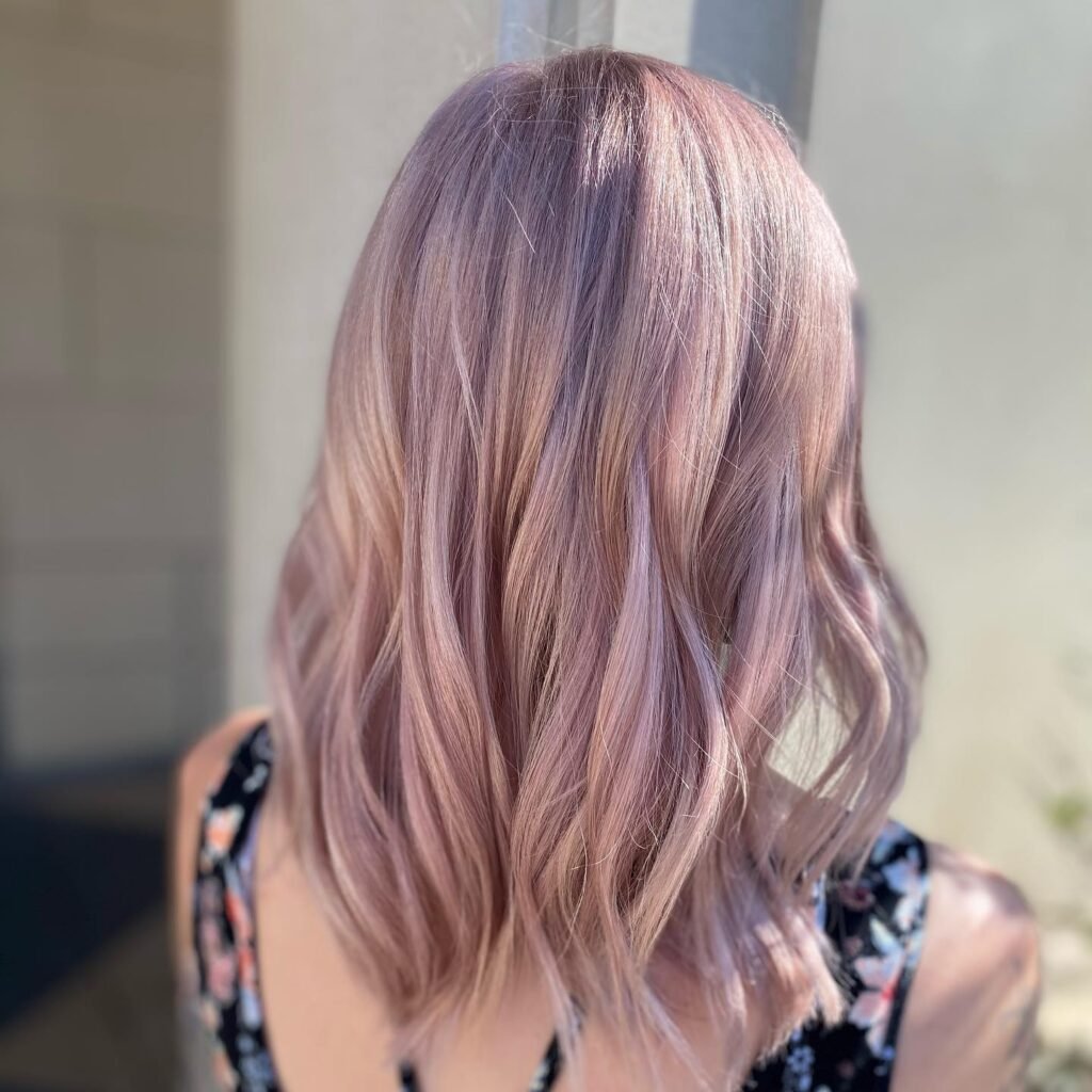 This hairstyle blends dusty rose tones into a soft balayage, creating a graceful transition from natural roots to pastel ends. The look is dimensional and soft, adding movement and depth to the overall style.