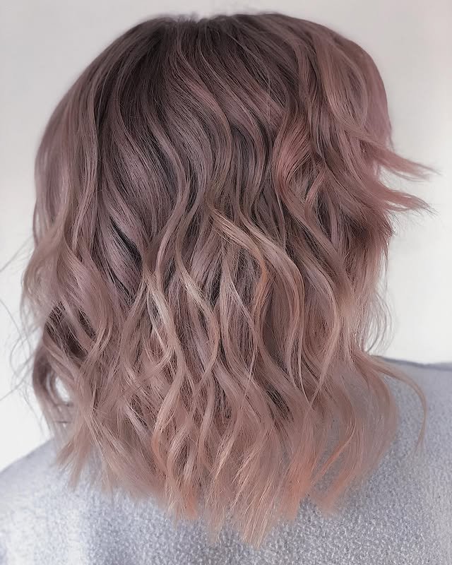 This hairstyle features soft, flowing waves infused with a muted dusty rose shade. The gentle curls enhance volume while the pastel tone adds a romantic, dreamy flair—perfect for a boho-chic look or casual sophistication.