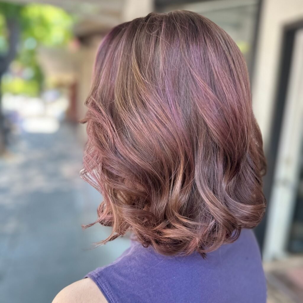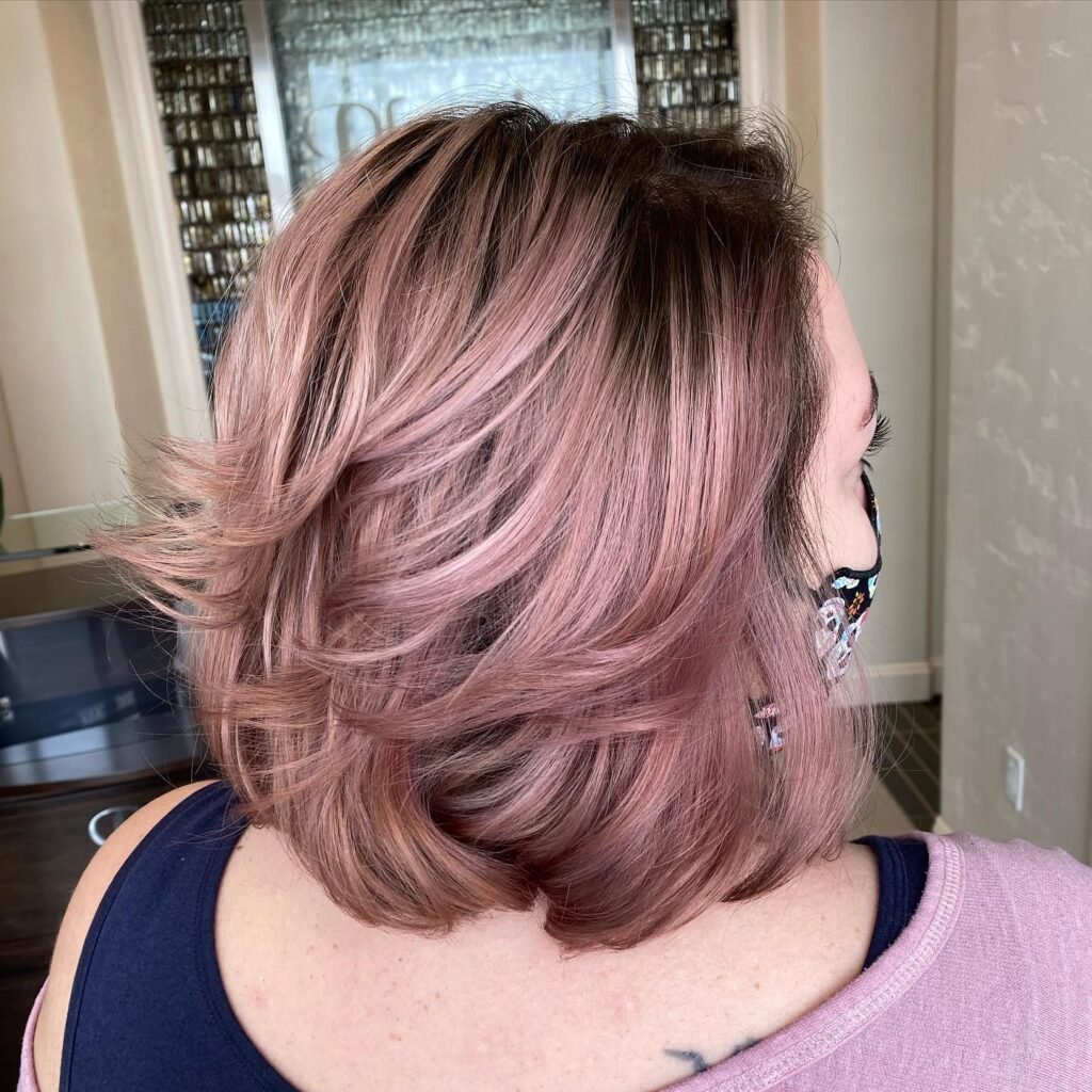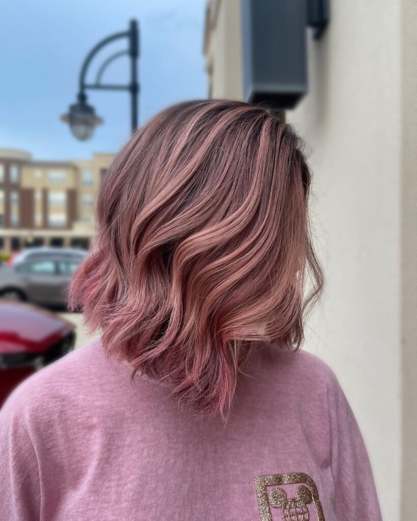 This hairstyle features gentle face-framing highlights that brighten the complexion while blending beautifully into the overall dusty rose color. It’s soft, flattering, and perfect for accentuating facial features.