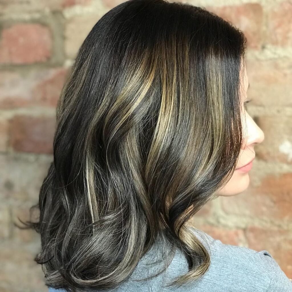 Balayage highlights bring out the depth and texture of this wavy medium-length hairstyle, giving it a sun-kissed, dimensional finish.