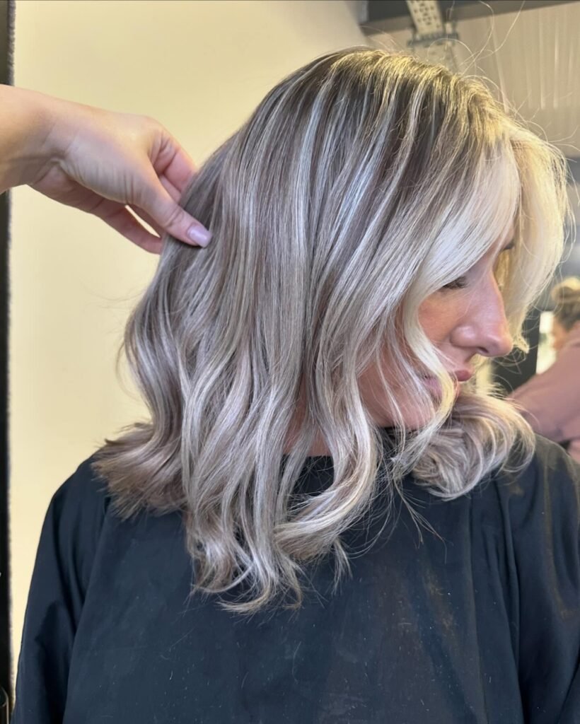 This textured long bob cut (lob) features effortless, tousled waves that add volume and movement. It’s a carefree yet stylish look that flatters any face shape.