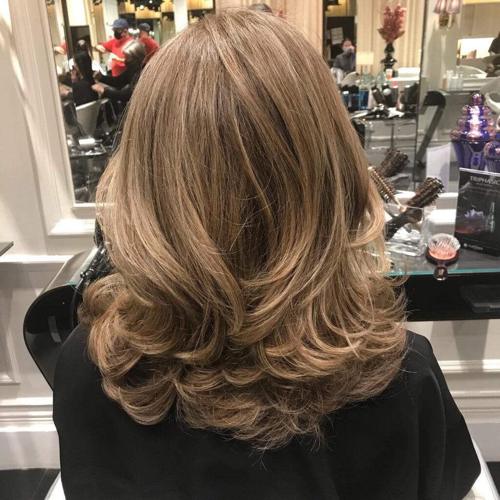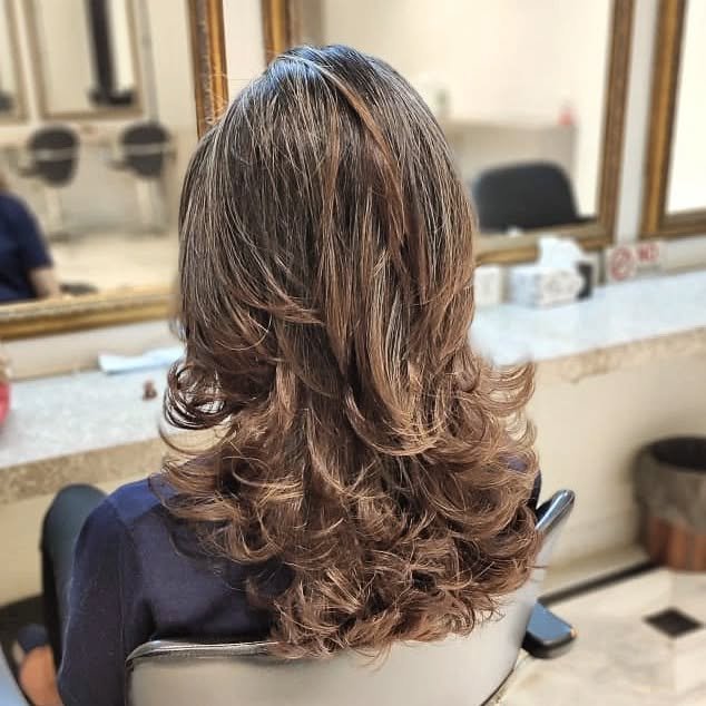 Feathered layers starting from the crown bring lift and shape to medium-length hair. A flattering choice for adding dimension.