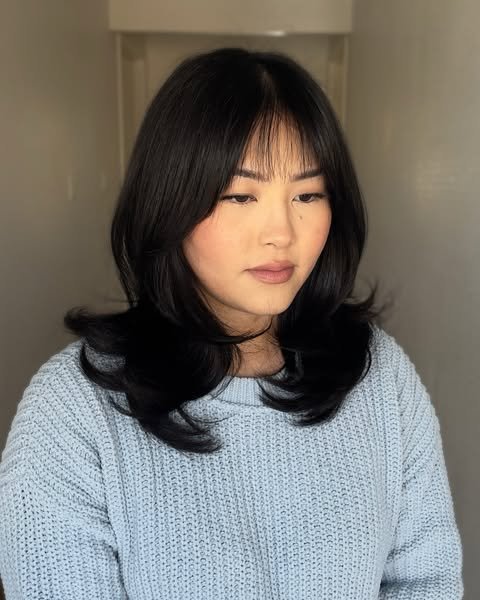 Side-swept bangs soften the face and pair beautifully with medium-length strands. This look is romantic, soft, and easy to wear.