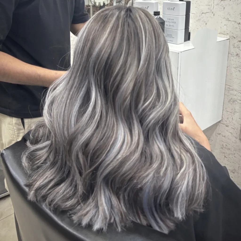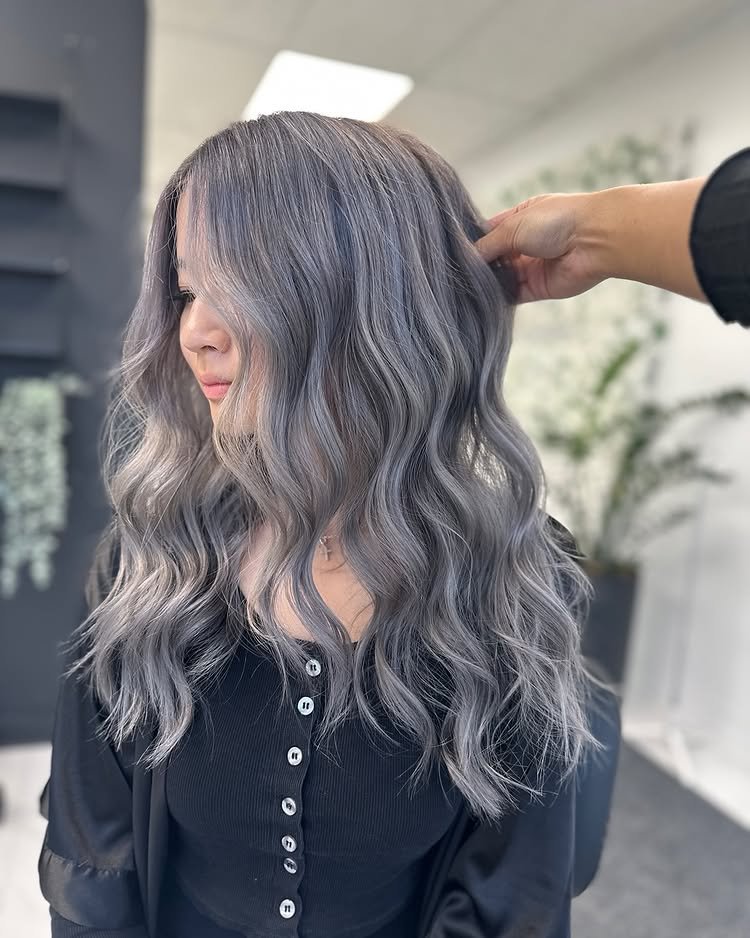 This wavy hairstyle is brought to life with silver hair that blends cool, ashy tones throughout the hair. The result is a dimensional, icy look that feels fresh and modern.