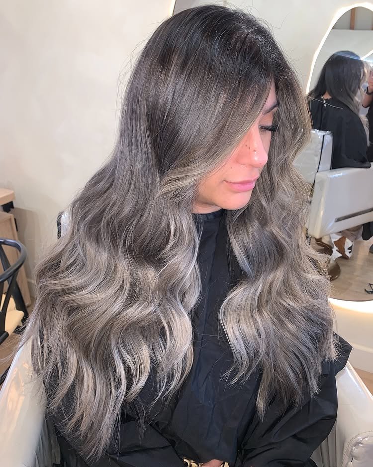 13. Voluminous Hair with Rooted Silver Balayage