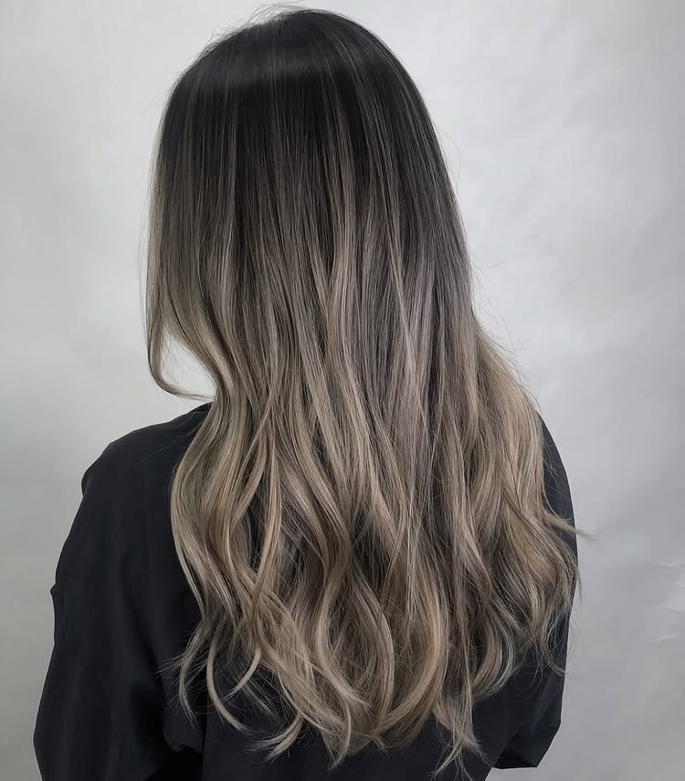 Dark roots transition seamlessly into shimmering silver lengths in this balayage idea with long hair. It’s perfect for those who want a bold contrast with low-maintenance upkeep.