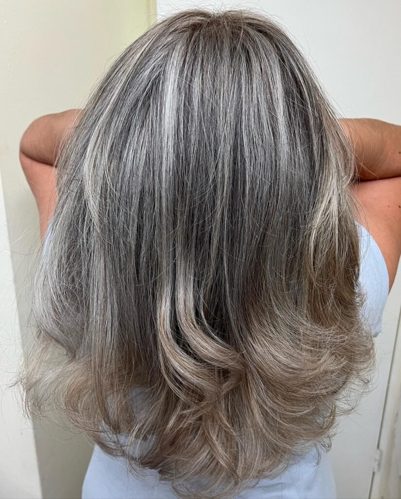 Mid-length hair gets a subtle upgrade with soft silver balayage that blends effortlessly into natural tones. It’s the ideal hairstyle for a gentle silver transition.