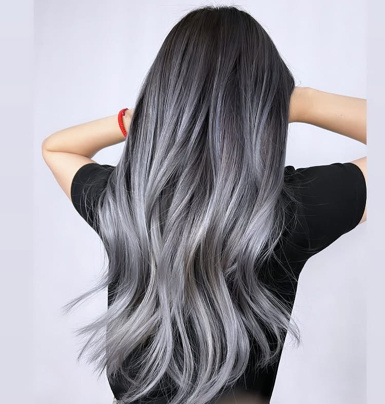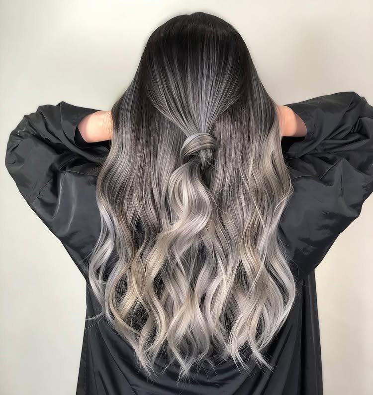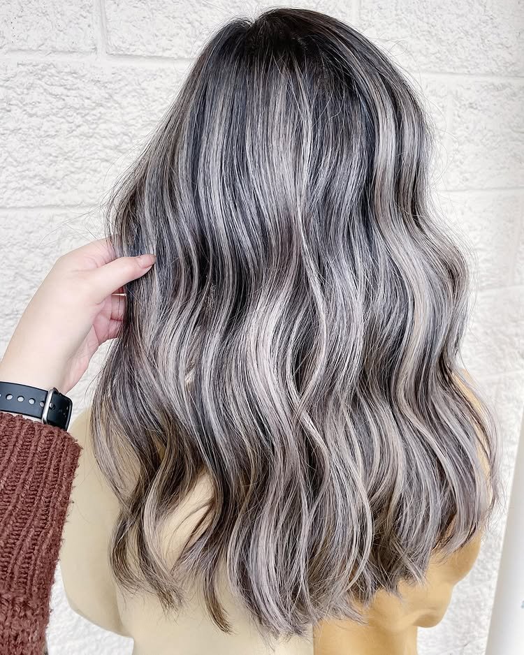 Rich brunette roots give way to flowing silver balayage, creating a striking contrast that’s bold yet wearable—perfect for a statement look.