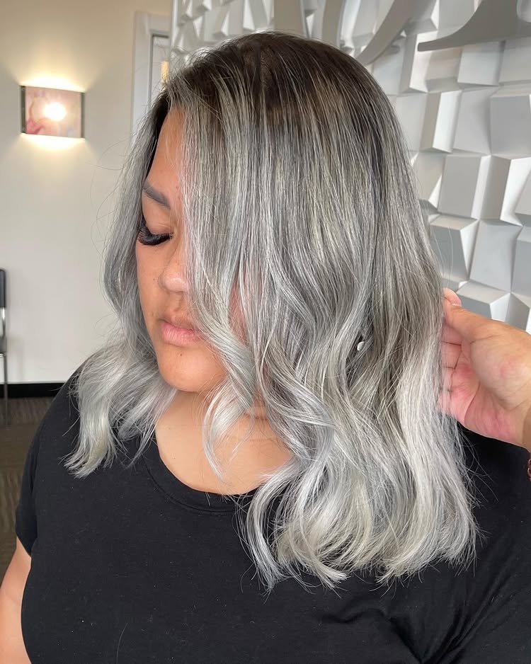 Rooted silver balayage blends deep tones into soft silver waves, offering fullness and rich contrast. Ideal for adding volume and drama.