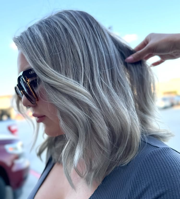 Frosted silver balayage on shoulder-length hair creates a clean, fresh appearance that’s both stylish and low-maintenance.