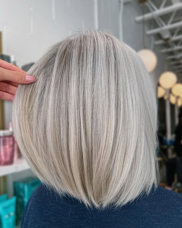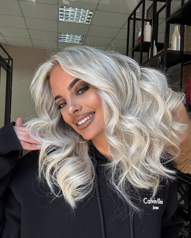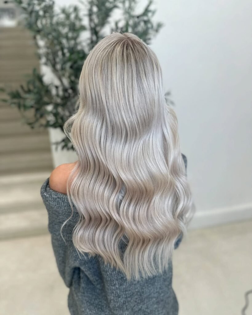 A glassy finish elevates this icy blonde hairstyle to editorial levels. It’s sleek, radiant, and eye-catching under any light.