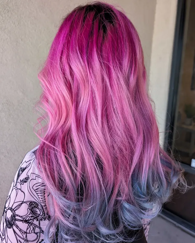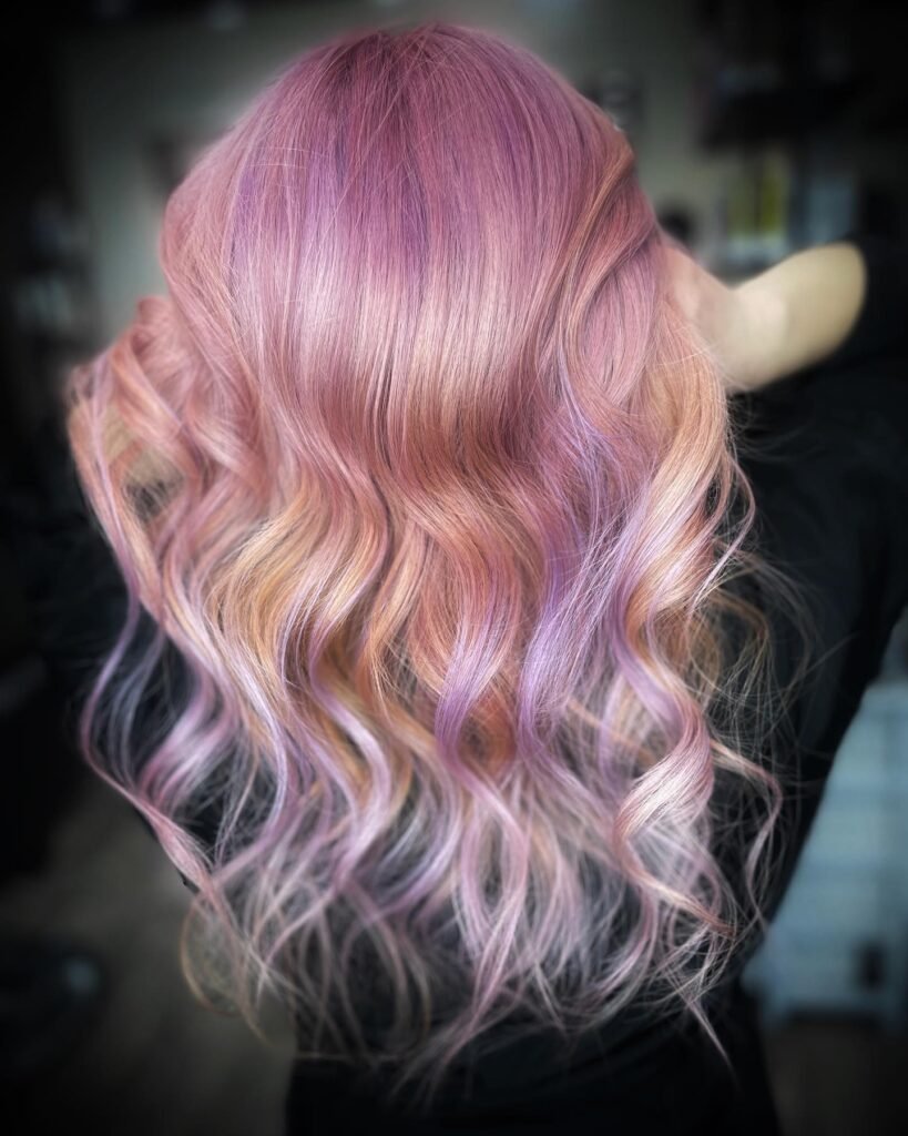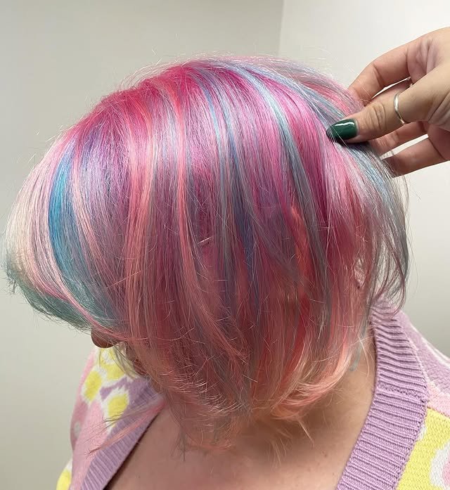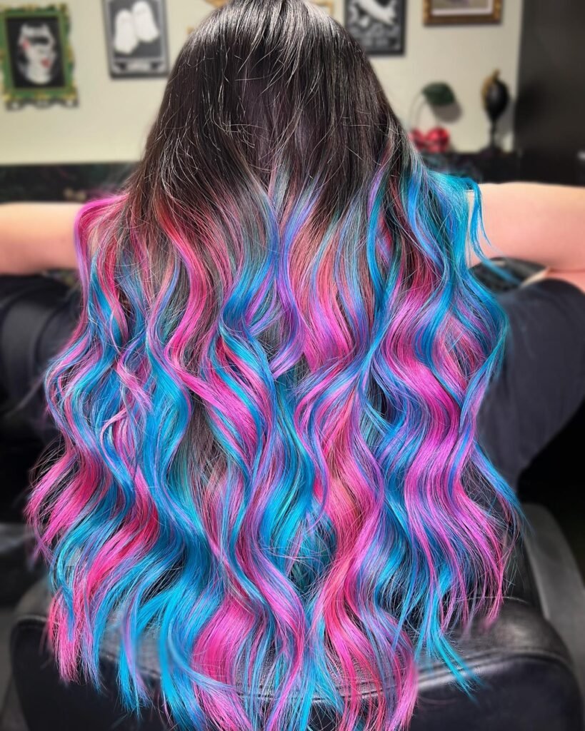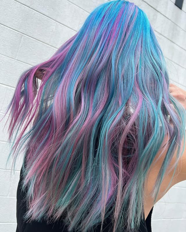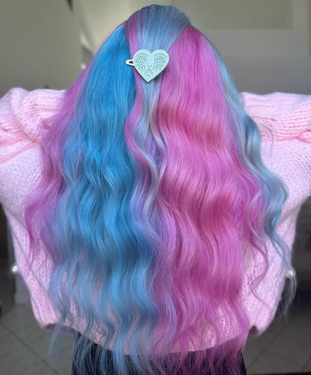 This blend of soft pinks and baby blues mimics cotton candy, giving the hair a playful and colorful finish.