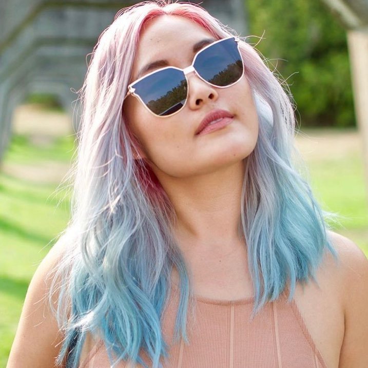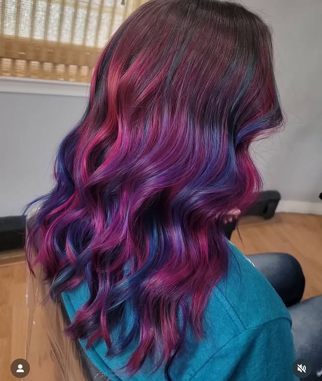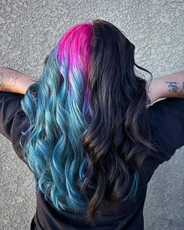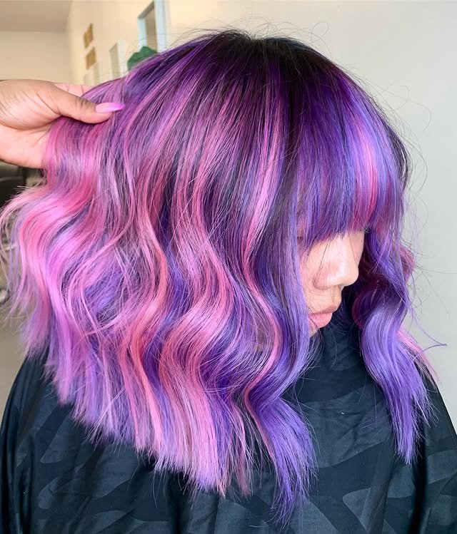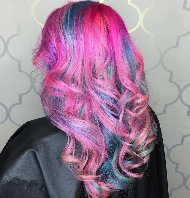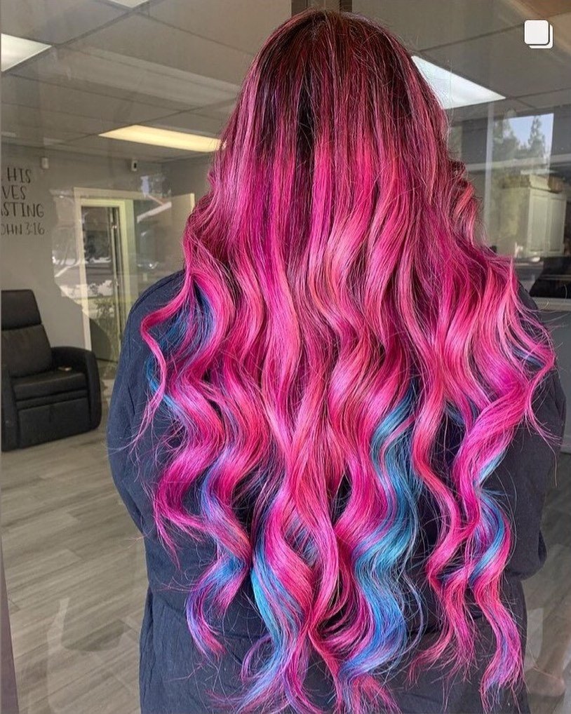 This blend of soft pinks and baby blues mimics cotton candy, giving the hair a playful and colorful finish.