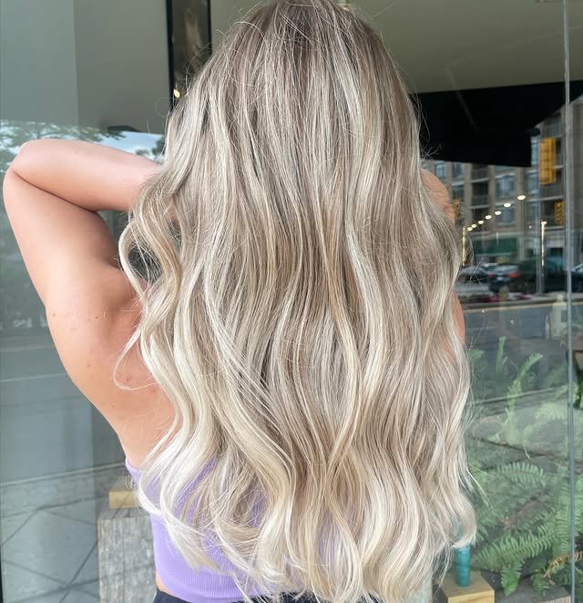 Silver undertones add a hint of shimmer to creamy blonde hair, giving it a cool, high-fashion feel.