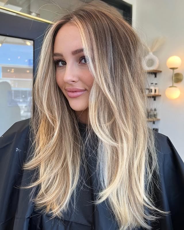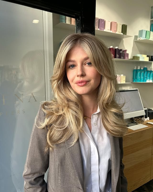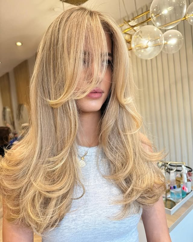 Layered cuts enhance the depth of creamy blonde tones, creating a hairstyle full of volume and soft movement.