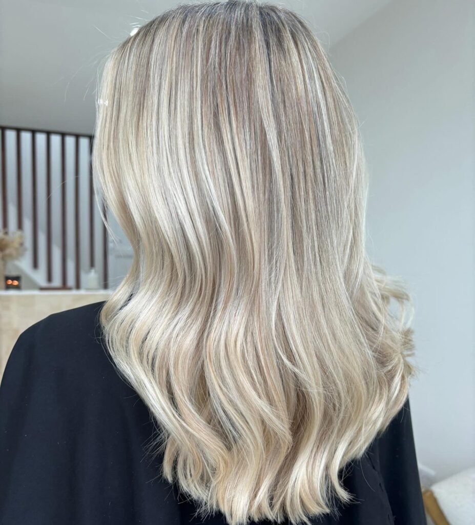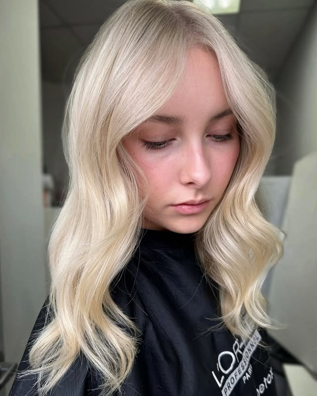 Cool, icy undertones enhance this creamy blonde shade, giving the hair a frosty yet soft glow that feels modern and refreshing.