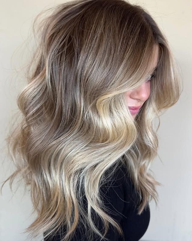 A smooth balayage blends creamy blonde shades with darker roots, offering a seamless transition of color and an effortlessly chic vibe.