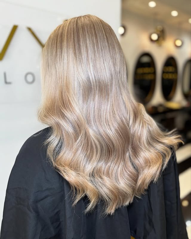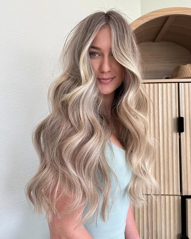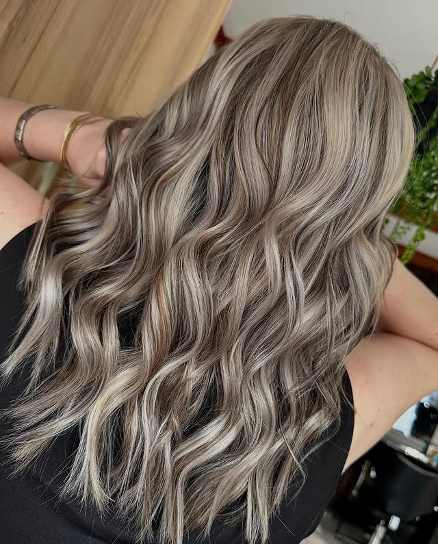 Soft waves come to life with cool-toned ash blonde highlights. They create movement and dimension that catch the eye. A great option for effortless beachy glam.