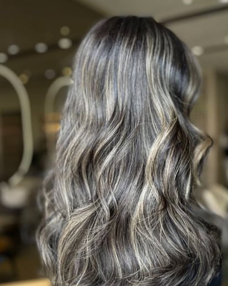 Dark brunette hair is brightened with subtle ash blonde streaks. This cool contrast adds depth without overpowering the natural tone. Ideal for those wanting a soft transition.