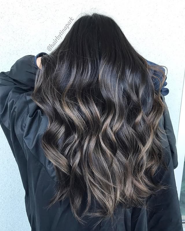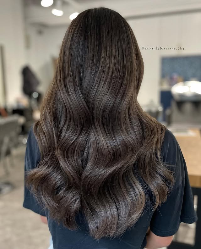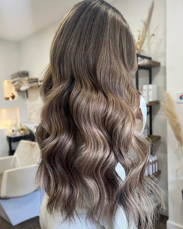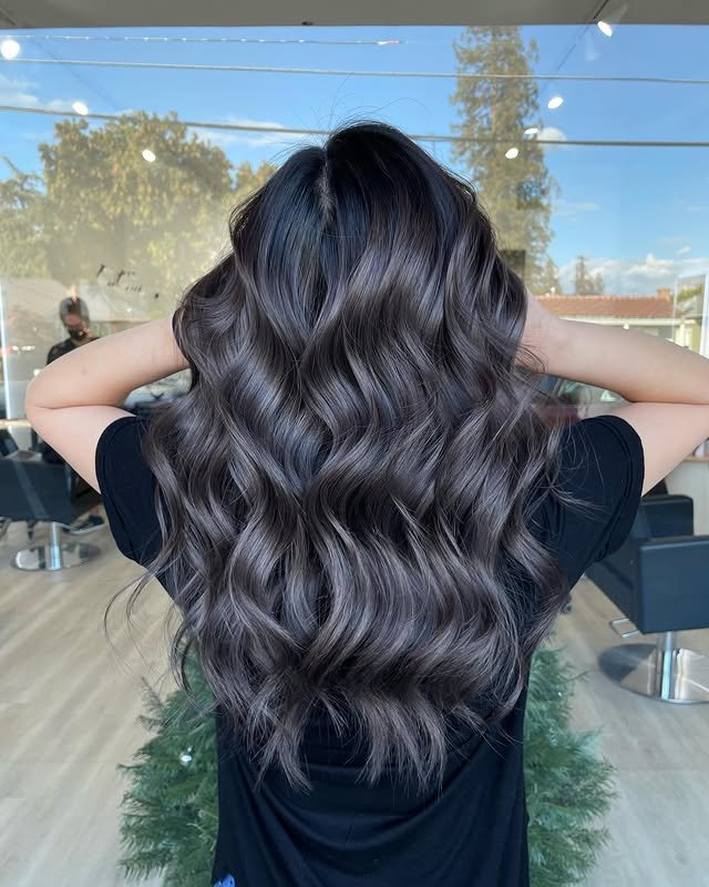Long strands bathed in cool ash tones create a soft, romantic style. This look is both graceful and trendy. A must-try for long hair lovers.