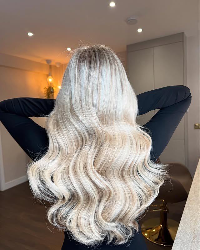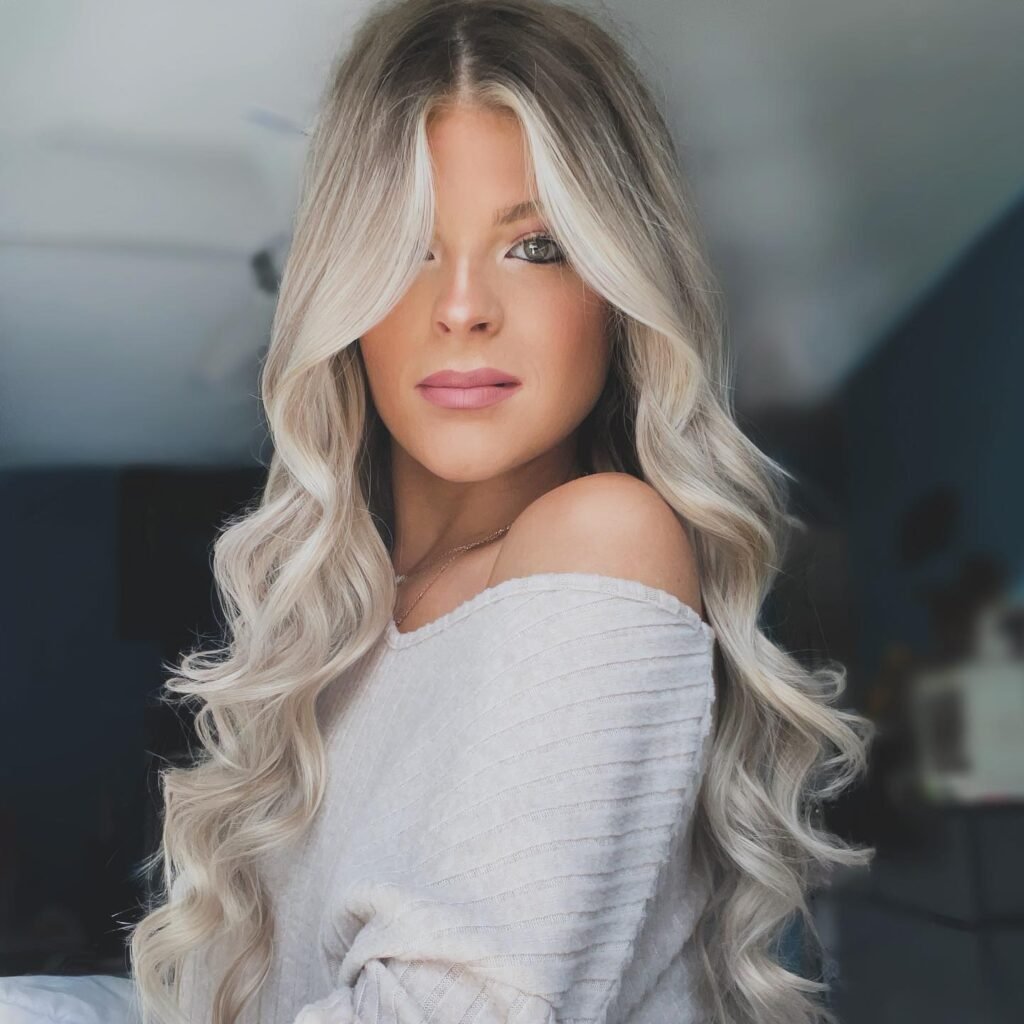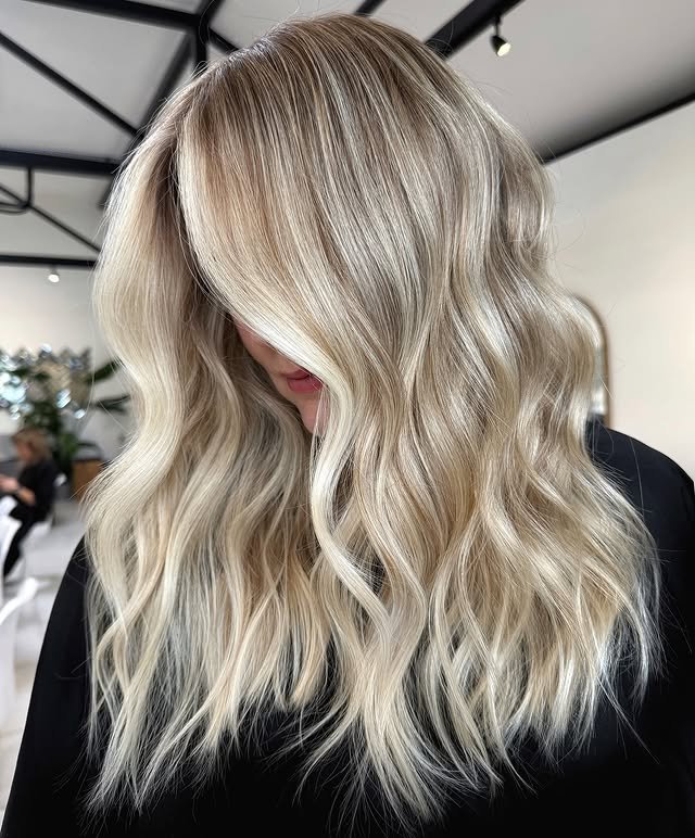 Ash blonde face-framing highlights bring cool tones to this layered hairstyle. It’s perfect for neutralizing warmth and achieving a sophisticated, sleek look. Best for cool-toned complexions.