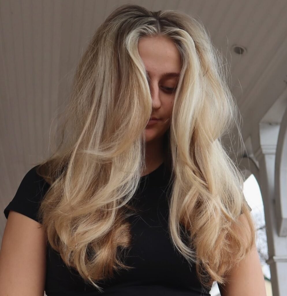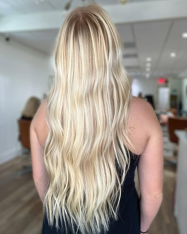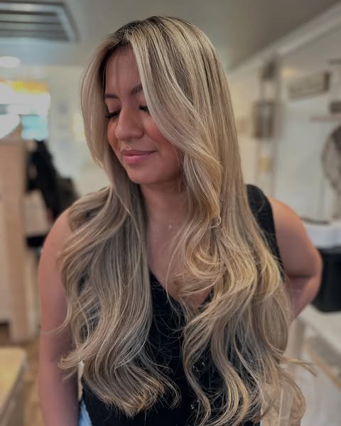 This hair look features soft blonde layers framing the face for an effortlessly chic appearance. It brightens your facial features without overpowering your natural base. A perfect everyday upgrade.