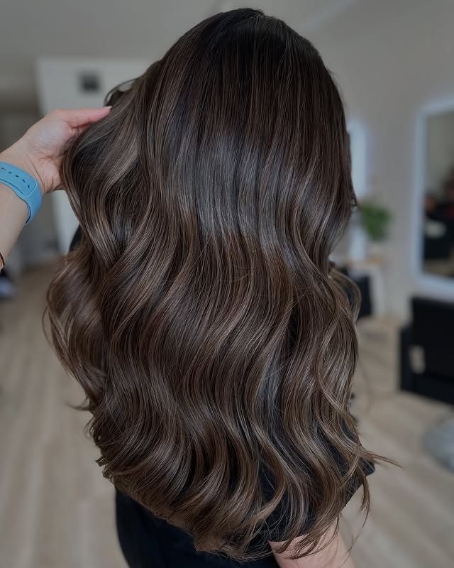 Dark chocolate roots gradually fade into soft brown ends, creating a deliciously rich hair color. The look is timeless, versatile, and full of shine. Ideal for adding smooth warmth to darker strands.