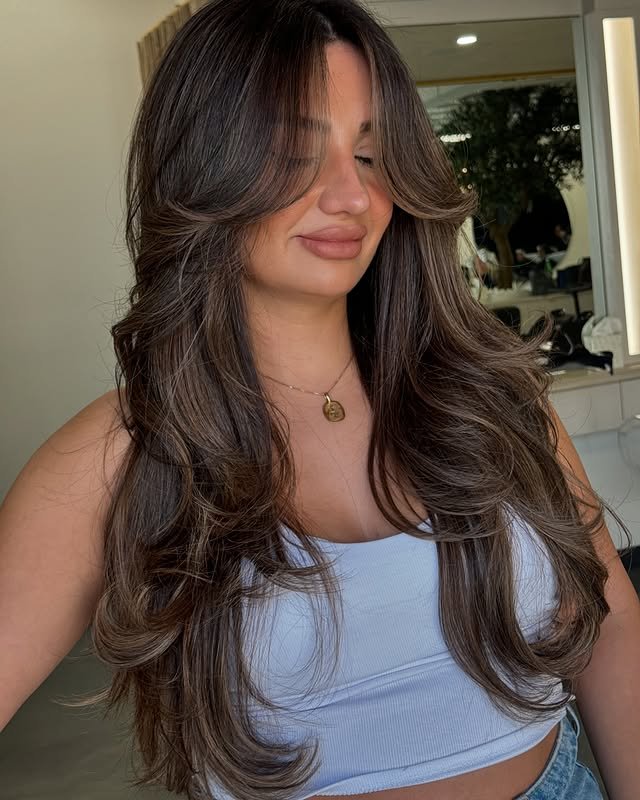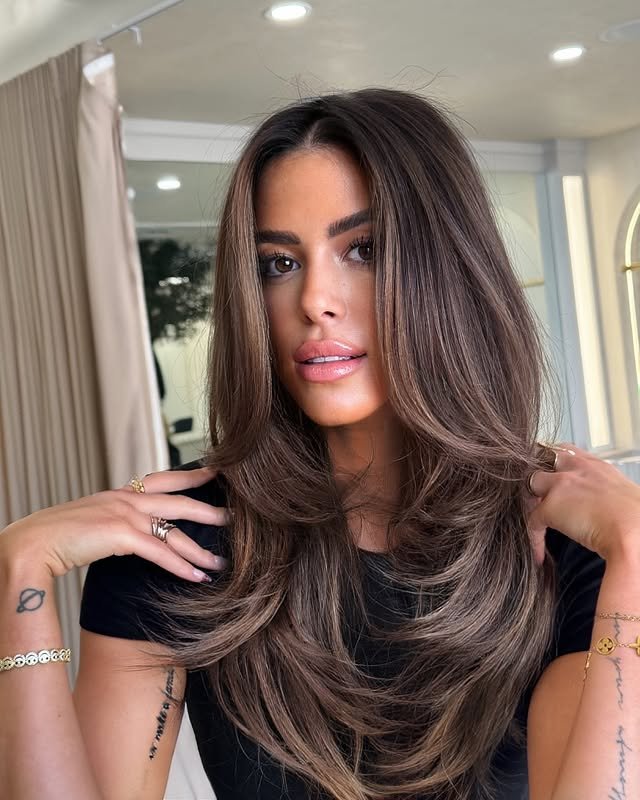 Rich chestnut hues give layered brown hair depth and movement, gradually lightening toward the ends. The result is a cozy and inviting hair color perfect for autumn vibes. A beautiful mix of warmth and volume.