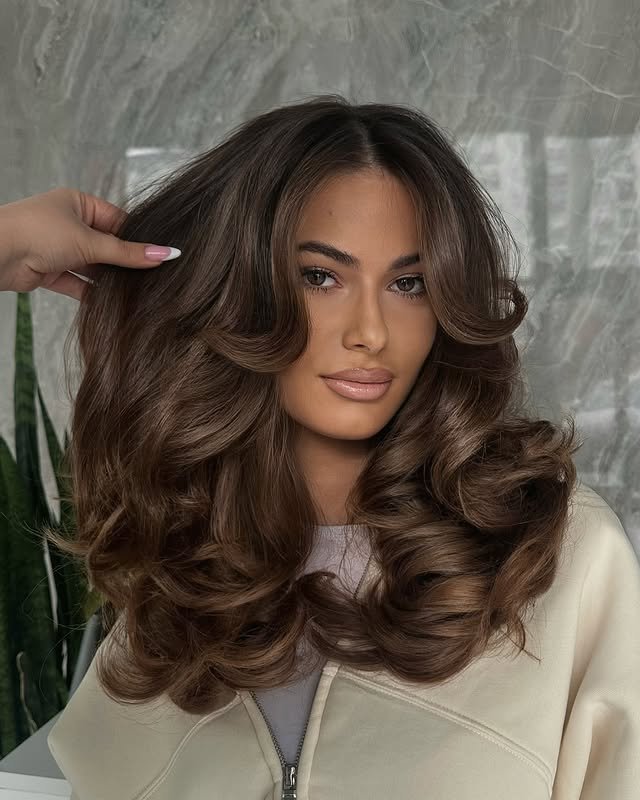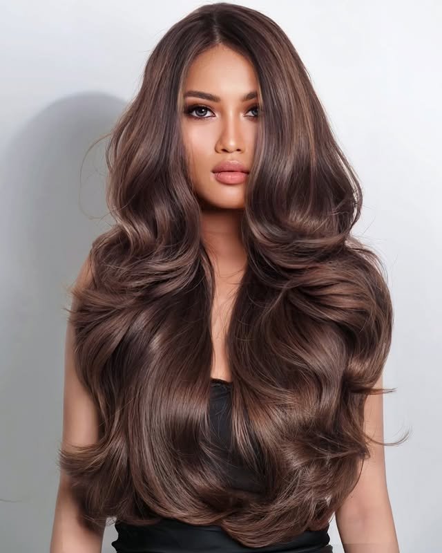 Golden honey tones flow through wavy brown hair, creating a soft and radiant style. This look is perfect for adding warmth and dimension, especially for warmer skin tones. It’s fresh, light, and effortlessly pretty.