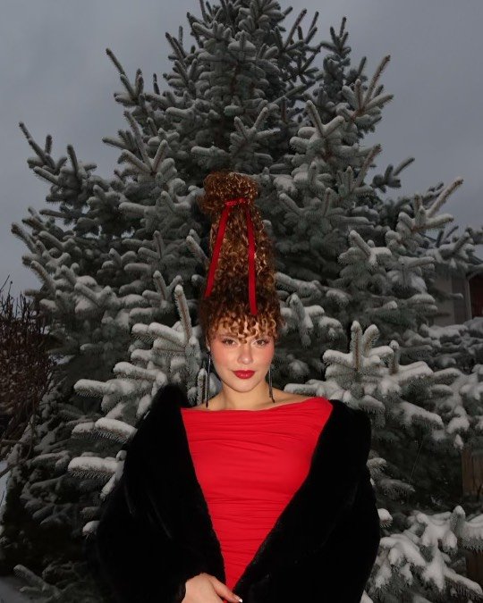 This half-up hairdo forms a bow using your own hair—cute, festive, and picture-perfect. Ideal for medium hair, this look captures the joy and playfulness of the holiday season.
