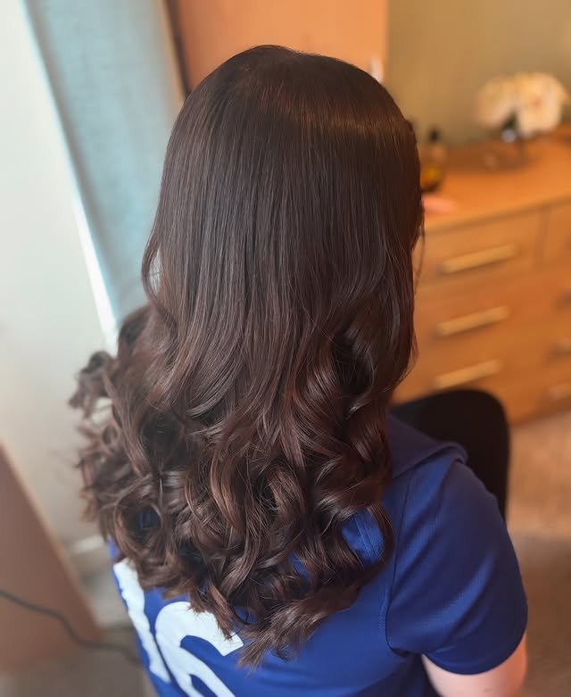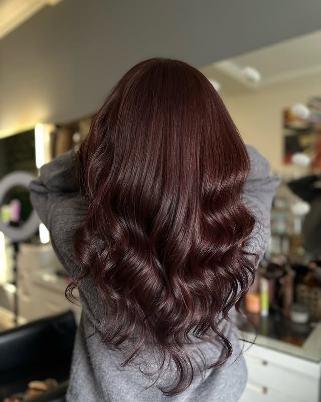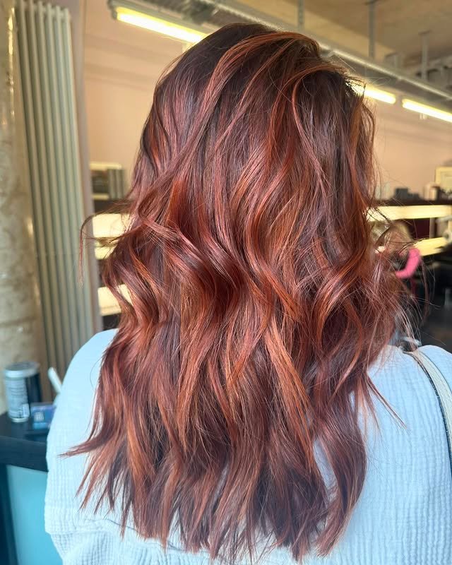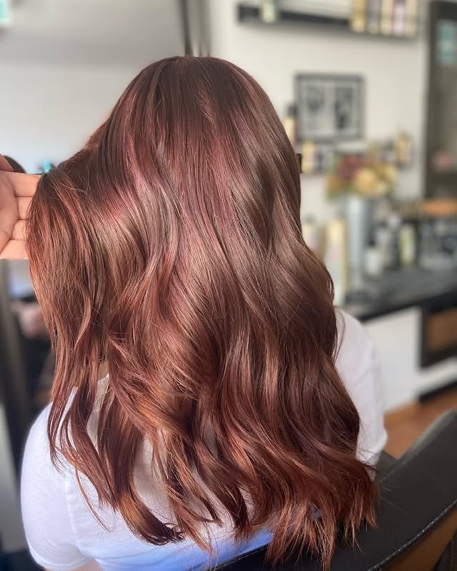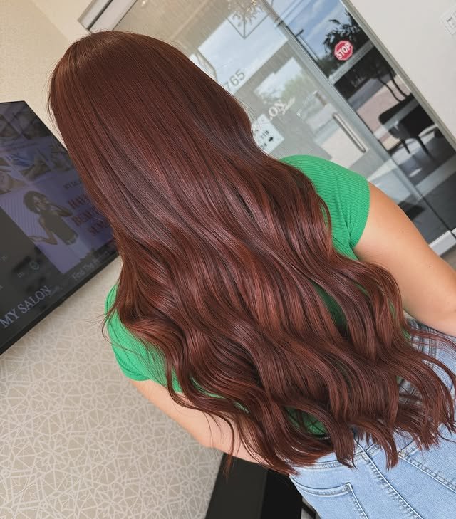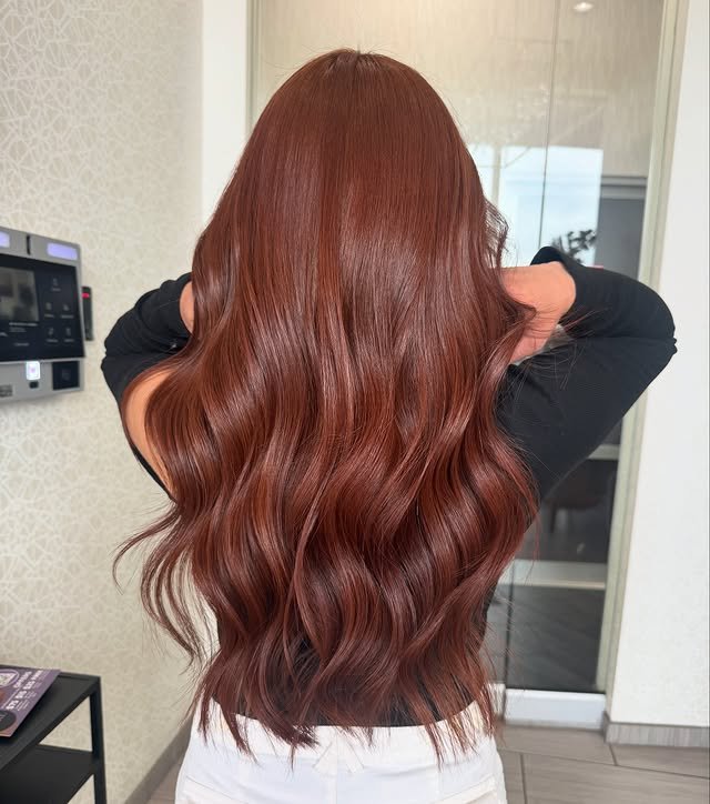 This long hairstyle shines with a rich blend of ginger and brown shades. The color radiates warmth while enhancing the natural flow and shine of the length. It’s a timeless, radiant look that flatters most skin tones and adds a subtle glow.