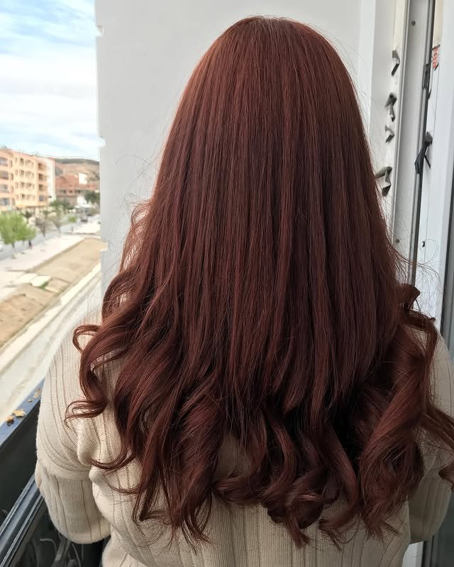 This hair color leans into its red roots with ginger brown tones that have a subtle crimson undertone. The result is a fiery yet elegant style that stands out without being too bold—a modern twist on a classic copper look.