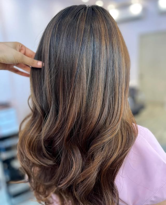 Dark hair is brought to life with ginger brown balayage softly painted throughout. The blend of tones adds depth and natural lightness, giving the style a sunlit, effortless vibe with a touch of artistic flair.