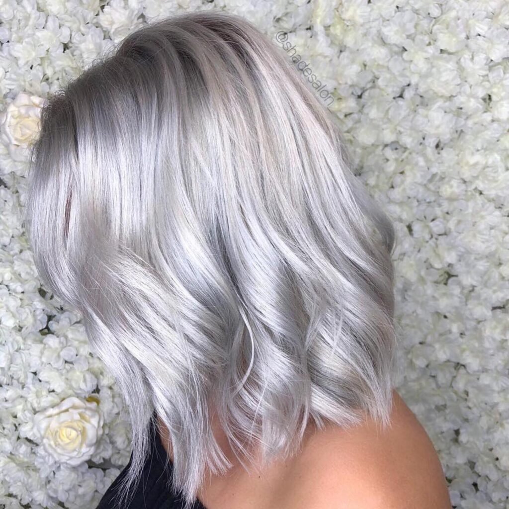A tousled bob brings a casual, lived-in edge to the sharp silver hue. This metallic silver hair look balances texture and tone perfectly. Great for everyday cool-girl vibes.
