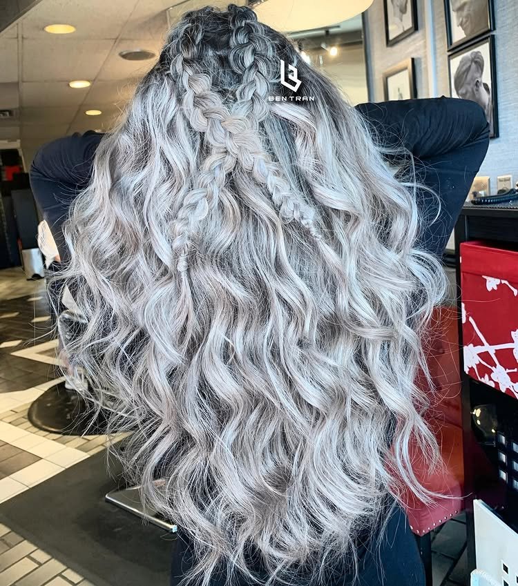 A classic braid becomes a standout feature when done with metallic silver hair. The interwoven strands reflect light, showcasing the tone’s brilliance. Ideal for boho and festival looks.