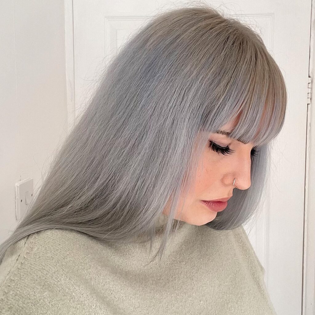 This sleek fringe paired with silver tones frames the face stylishly. The metallic shine gives the bangs a unique reflective quality. Great for making a chic, edgy statement.