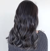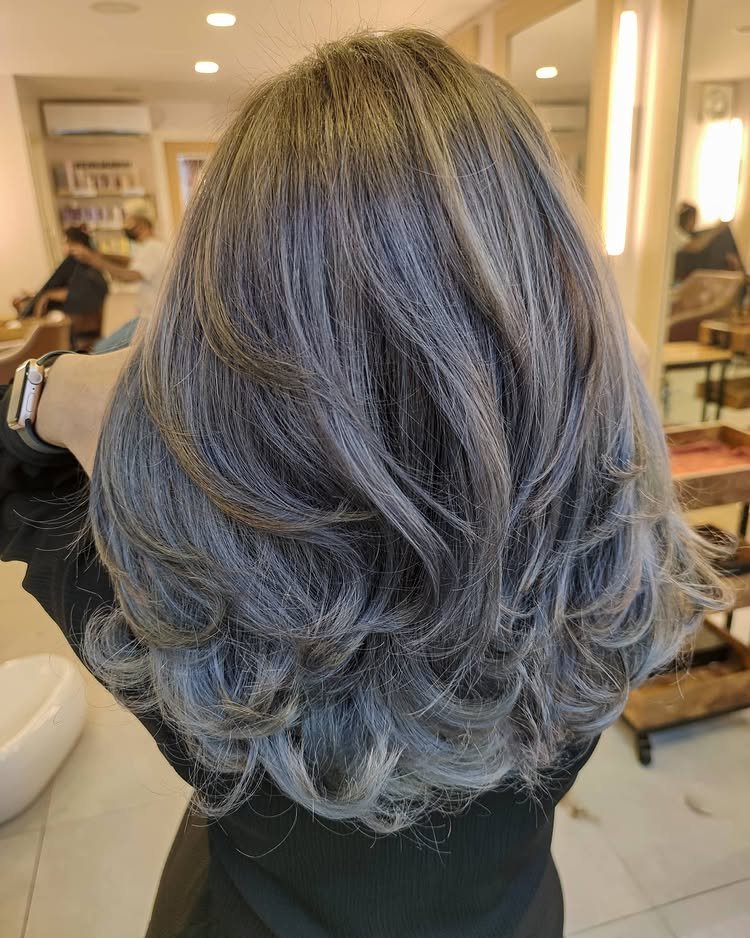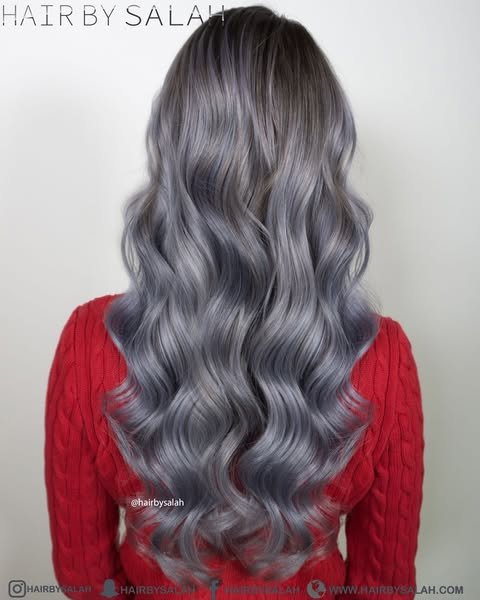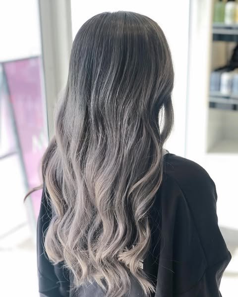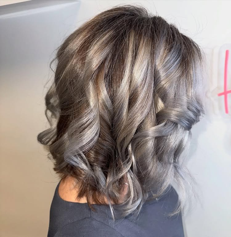 Dark roots fade seamlessly into silver strands, adding contrast and depth. This shadow-root technique makes the hair color pop while remaining low-maintenance. A trendy take on a classic.