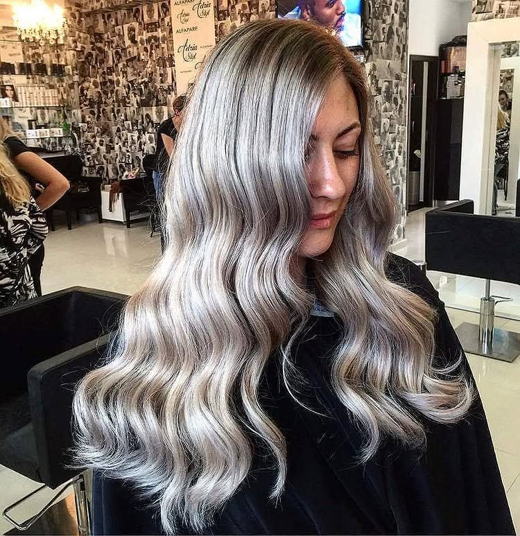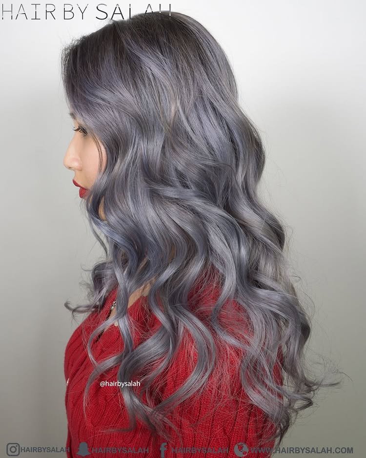 Loose waves add depth and movement to this luminous metallic silver hair color. The flowing style softens the bold shade, making it wearable and feminine. A perfect mix of edgy and elegant.