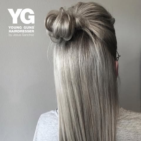 This elegant updo highlights the dimension and shine of metallic silver hair. Perfect for weddings, formals, or any high-glam moment. The tone adds a magical, modern touch.