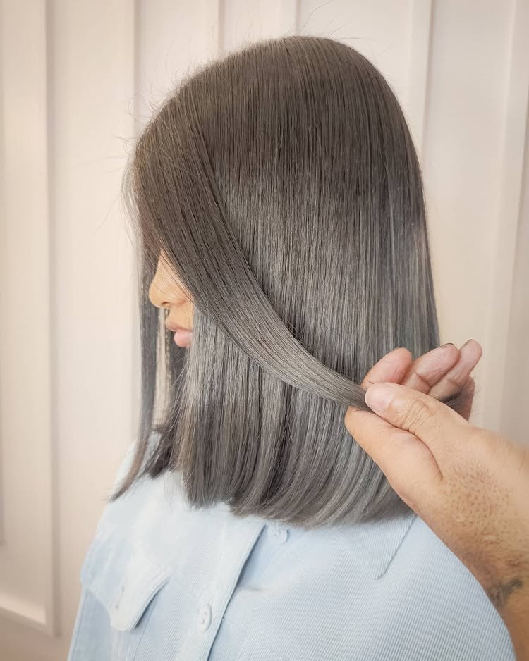 This mid-length cut lets metallic silver hair take center stage. It’s simple yet striking, with a balanced amount of shine and structure. Effortless and sophisticated.